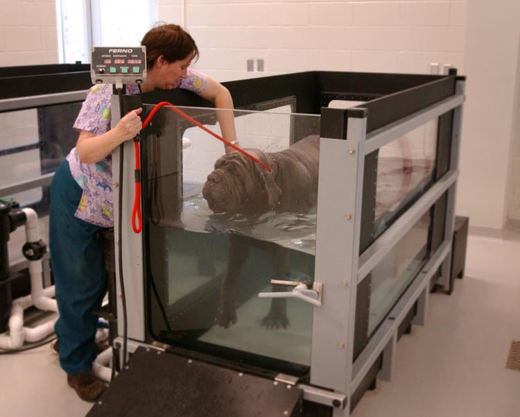 Veterinary assistant Carol Tuft checks on a patient walking in one of two new underwater treadmills.
