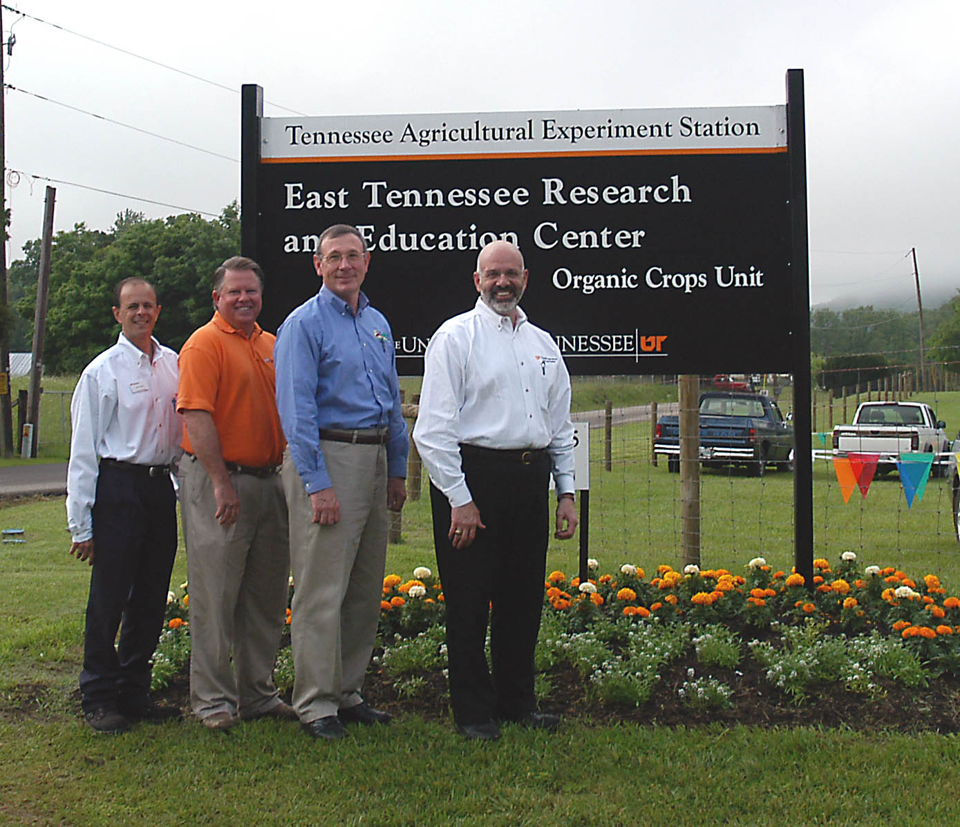 Officials from the UT Institute of Agriculture and the Tennessee Department of Agriculture show off the sign for the new Organic Crops Unit of the UT East Tennessee Research and Education Center in Knoxville. From left to right, Tim Cross, dean of UT Extension; Bill Brown, dean of UT AgResearch; Joe Gaines, Asst. Comm. of TDA; and Joseph DiPietro, UT vice president for agriculture.